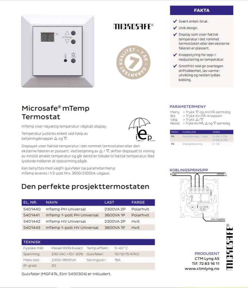 MTemp viser nøyaktig temperatur i digitalt display. Temperatur justeres enkelt ved hjelp av betjeningsknapper + og -.Displayet viser faktisk temperatur i det rommet termostaten eller den eksterne føleren er plassert. Ved betjening av + / -, skifter displayet til visning av innstilt ønsket temperatur og går deretter tilbake til faktisk temperatur.Rød lysdiode indikerer at oppvarming pågår.