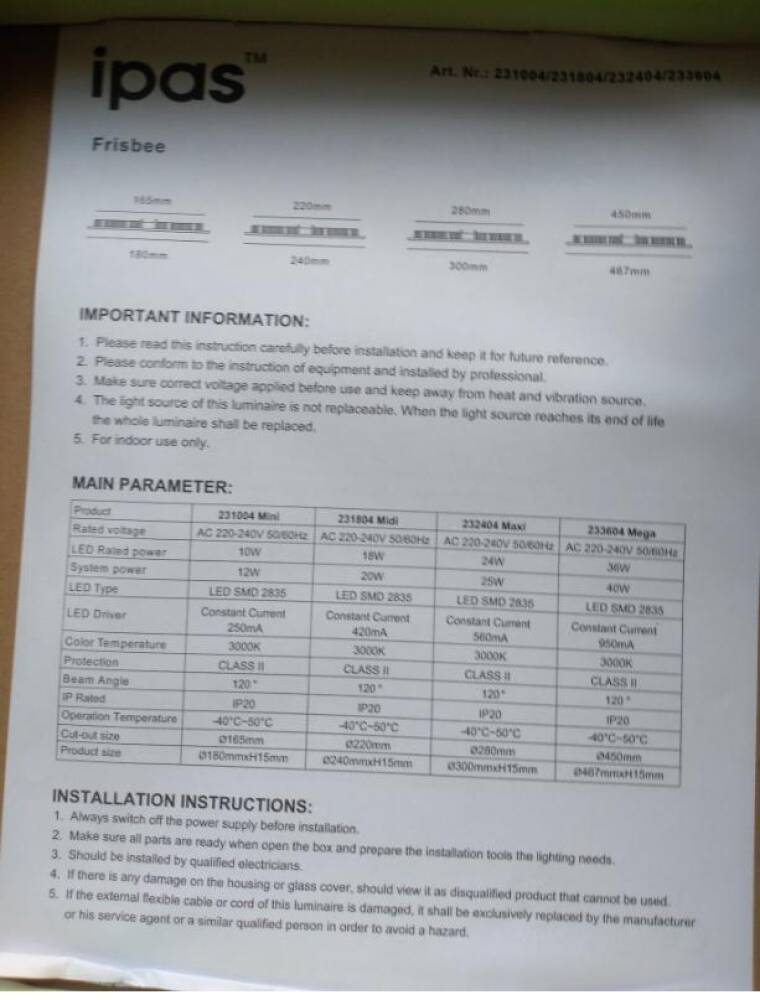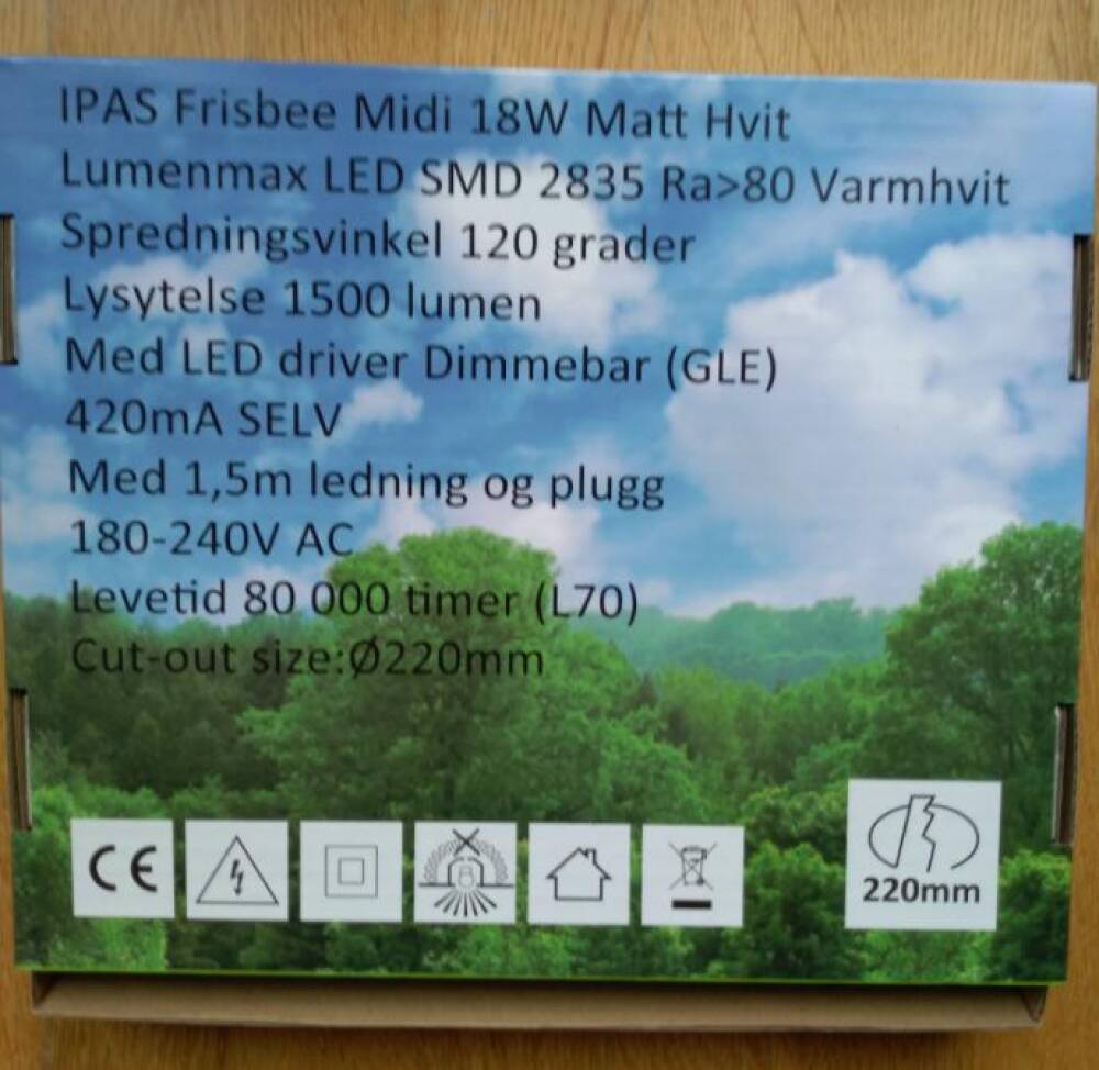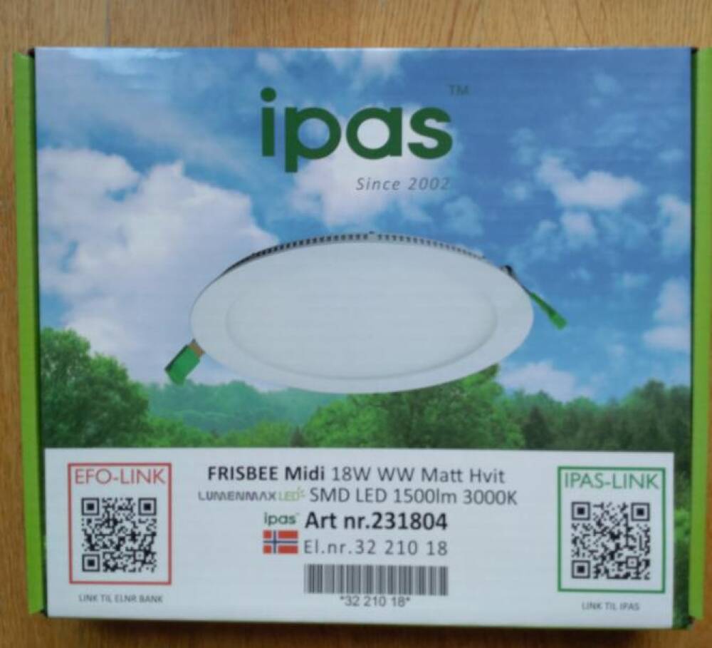 Art kode: 231804 El.nr. 32 210 18 IPAS Frisbee midi 18W 3000K 1500lm hvit. Ny meget prisgunstig lavtbyggende downlight med SMD LED. Komplett med dimmebar LED-driver (GLE). Finnes også som Mini 10W og Maxi 24W.