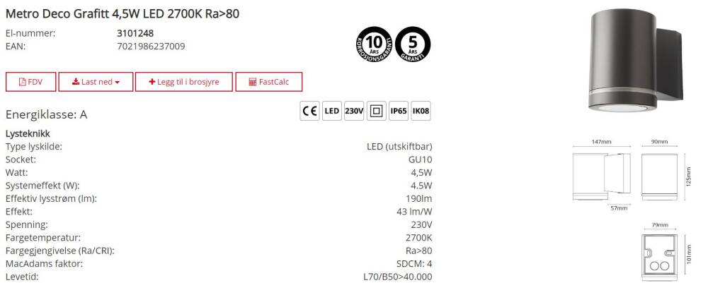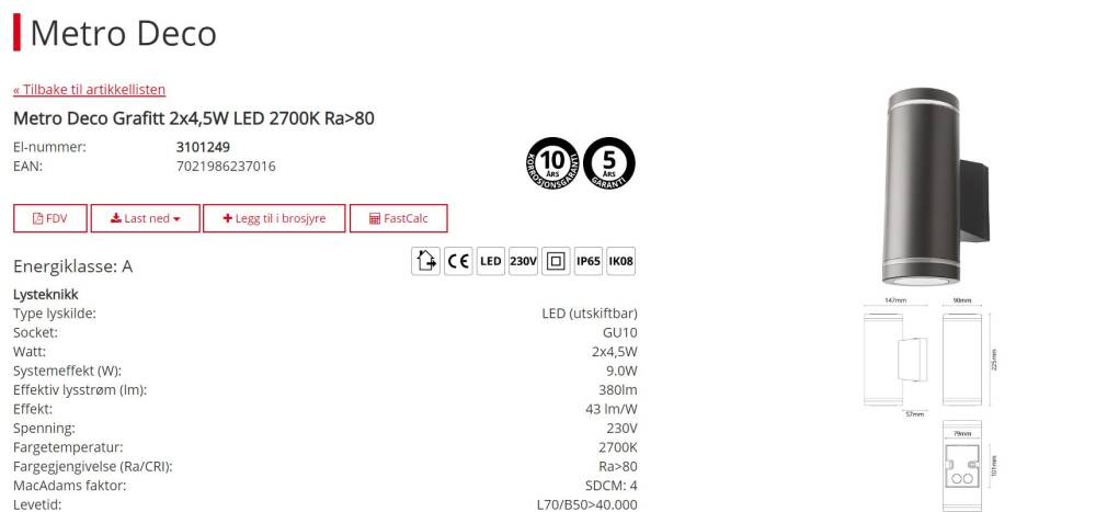 Finnes som opp-/nedlys eller kun nedlys. Armaturen har en utskiftbar GU10 LED-lyskilde (inkludert), og er dimbar med faseavsnittdimmer. Vi anbefaler LEDDim400 og LEDDim Smart. Enkel montering med veggbeslag med stikkforbindelse til lampen, to kabelinnganger og mulighet for både synlig og skjult kabling. Kan monteres på hjørne med hjørnefeste (selges separat). 10 års korrosjonsgaranti, beskyttelsesklasse IP65, slagfasthet IK08.